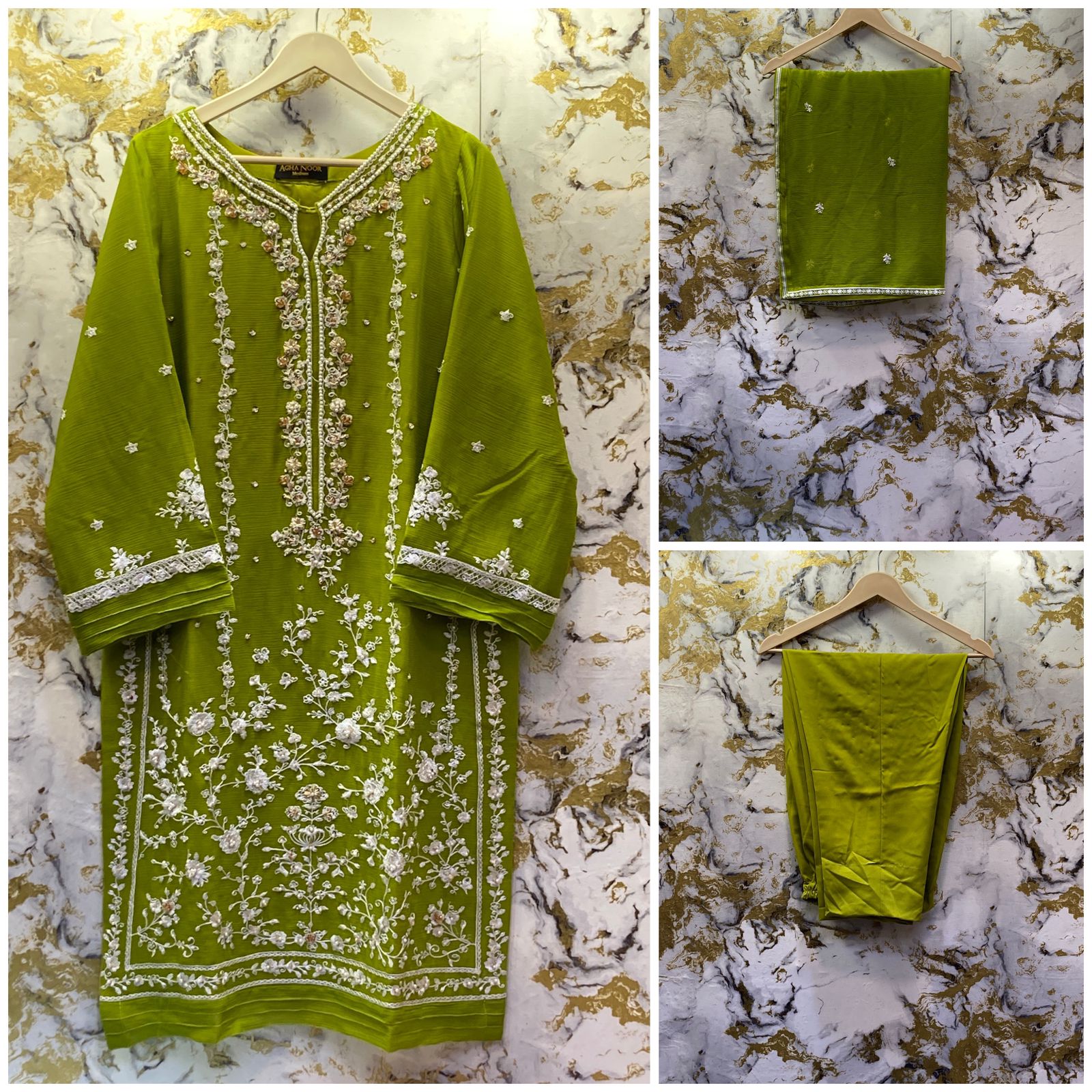 3 Piece - Pure Embroidered Bamber Chiffon PARROT - Green Suit AN-0013