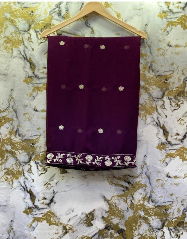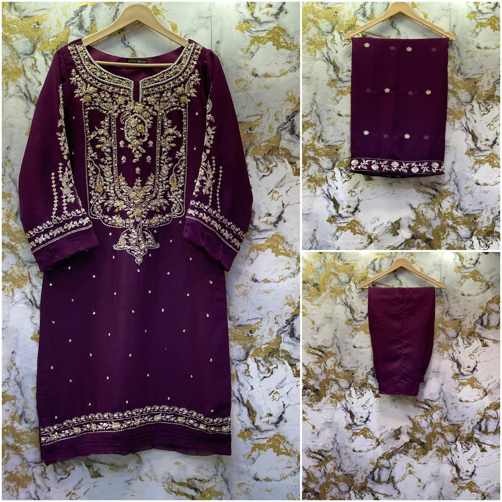 3 Piece - Pure Embroidered Bamber Chiffon DEEP - PLUM Suit AN-0002