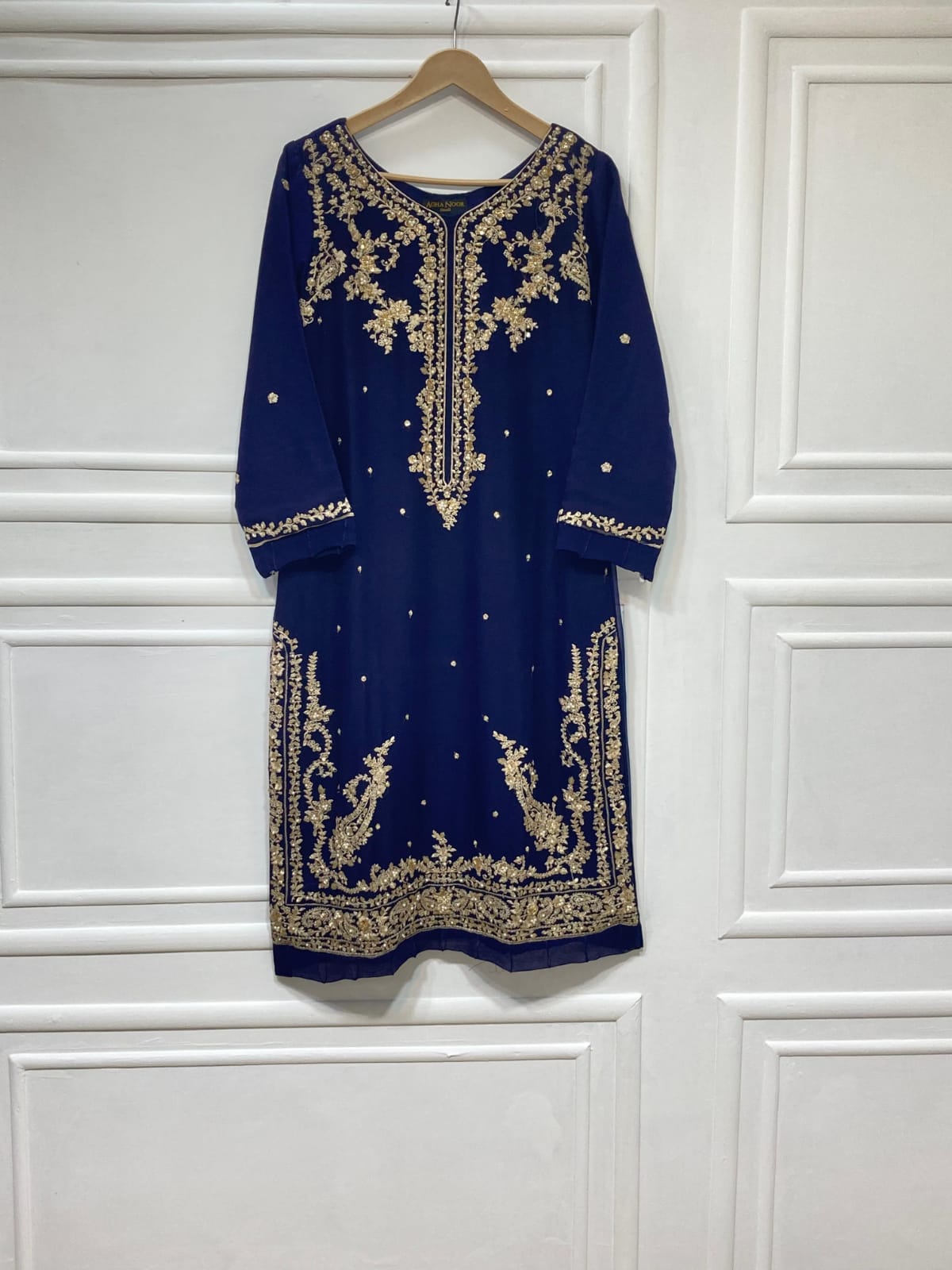 Shirt: Bamber Pure Chiffon with exquisite embroidery and heavy handwork, giving it a regal and timeless appeal.