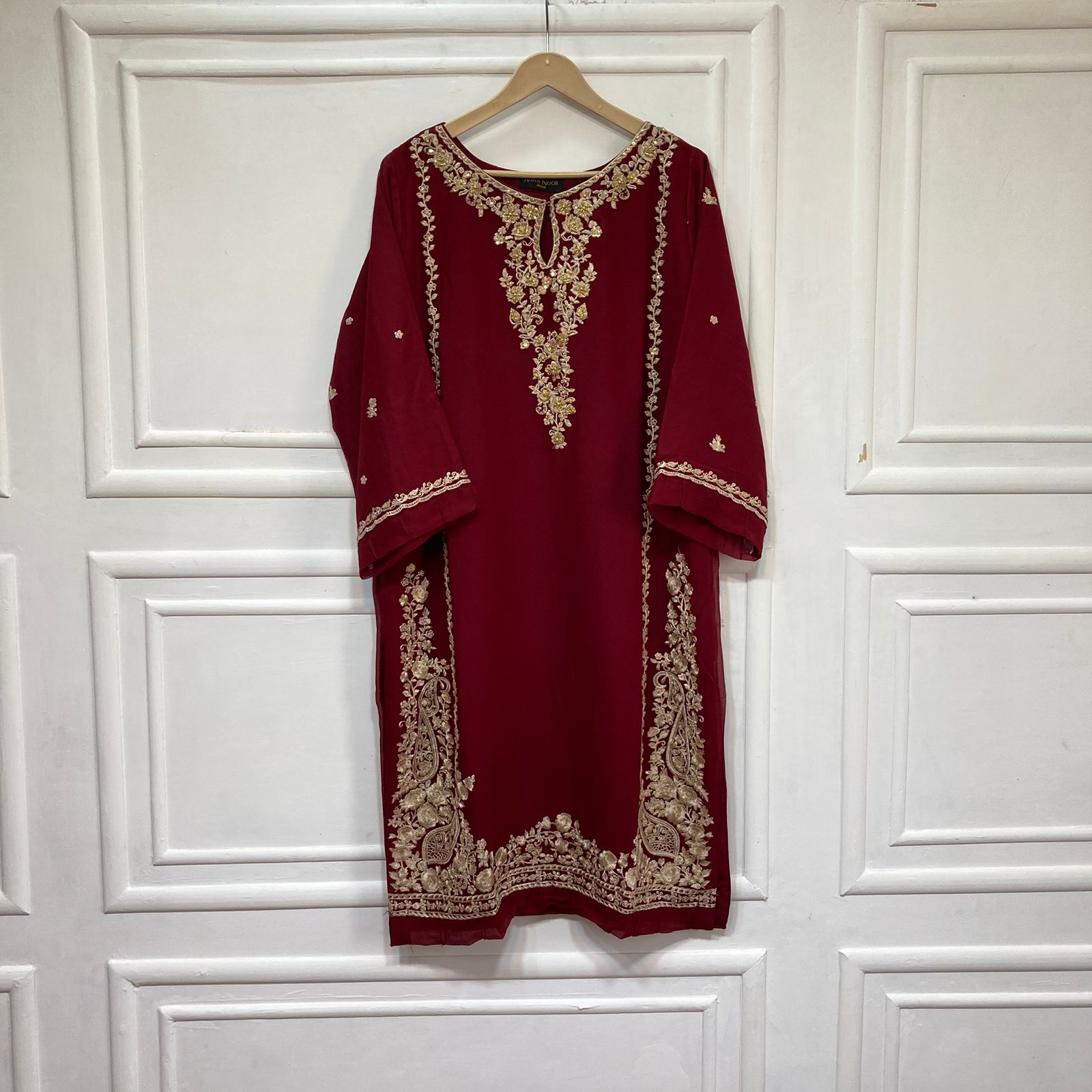 Paired with an embroidered chiffon dupatta and plain crap silk trousers, this outfit is perfect for formal events, weddings, and festive occasions. A master-quality replica with premium finishing for lasting elegance.