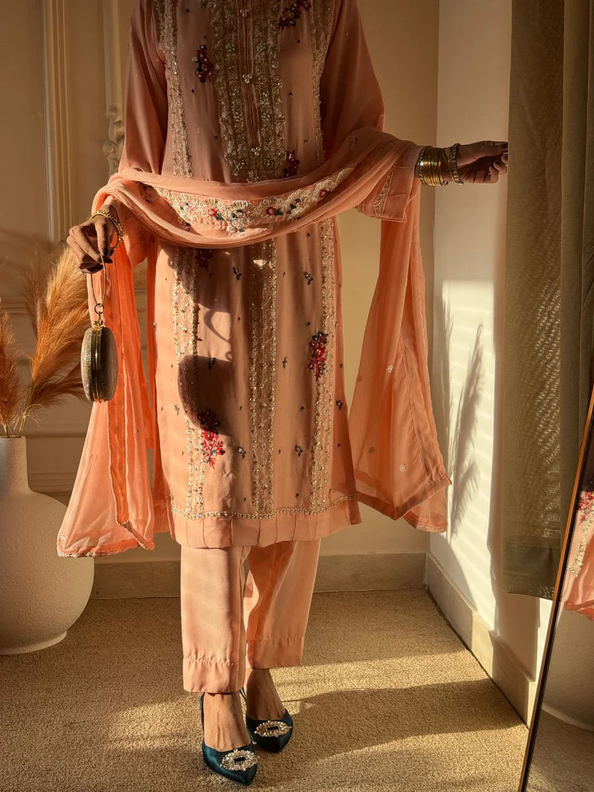 Paired with an embroidered chiffon dupatta and plain crap silk trousers, this outfit is perfect for formal events, weddings, and festive occasions. A master-quality replica with premium finishing for lasting elegance.